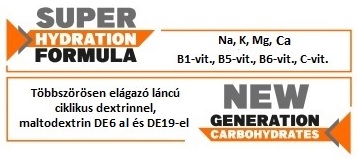 Super Hydro szénhidrátkeverék [maltodextrin DE 19, glükóz, többszörösen elágazó láncú ciklikus dextrin (Cluster Dextrin®), maltodextrin DE 6, izomaltulóz*(Palatinose™), fruktóz](82%), savanyúságot szabályzó anyag: citromsav; nátrium-klorid, aroma, trinátrium-citrát, trikálium-citrát, kálium-glukonát, kalcium-karbonát, csomósodásgátló: szilícium-dioxid; magnézium-karbonát, édesítőszer: szukralóz; L-aszkorbinsav (C-vitamin), pantoténsav (B5-vitamin), színezőanyag: riboflavin; piridoxin-klórhidrát (B6-vitamin), tiamin-klórhidrát (B1-vitamin). * Az izomaltulóz glükóz és fruktóz forrás.