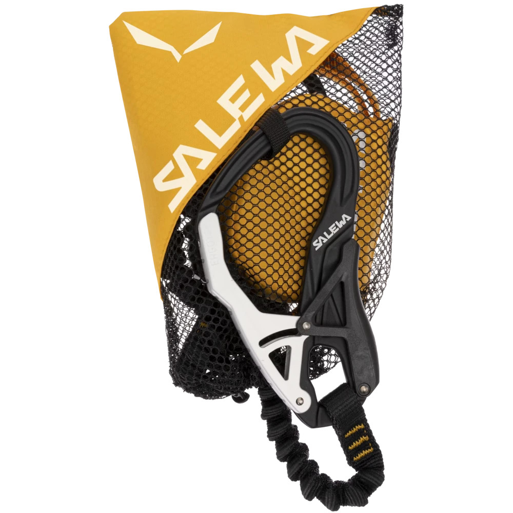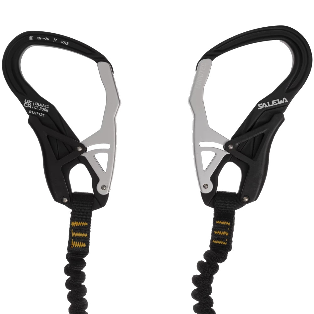 Az ergonomikus Ergotec 3.0 karabinerek szépen illeszkednek a kézbe, kesztyűben is könnyen, intuitívan kezelhetőek és megnövelt, túlméretes nyelvnyílással rendelkeznek a gyorsabb és még biztonságosabb be- és kiakasztásért, auto-locking mechanizmusa pedig megakadályozza a véletlen nyitást. A robosztus acél nyelvvel kialakított alumínium karabinerekkel felszerelt set rugalmas hevederkötelei minden esetben testhez közeli kezelést tesznek lehetővé ráadásul rögzítőhurokkal is ellátta a gyártó.